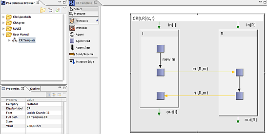 Now use the toolbar items yourself to produce the following two party CR[I,R](c,r) protocol description. Don’t forget that you have to reselect toolbar items after each step. For example, when you want to reposition text, you must select Select.