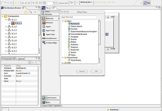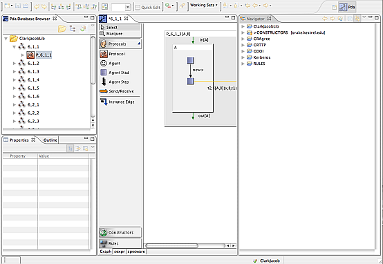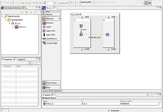 Search This item has three entries: Search …, File, and Pda Search, the first of which really contains the other two. Pick Search… and you will see all choices offered to you. The Pda tab is the most interesting, since it enables you to search either your working set or your whole workspace for nodes (protocols, constructors, or rules) or references to nodes. You can see this at work by searching for P_6_1_1. The result is shown in the next figure. Notice that a Search Glass icon has been inserted at the third slot in the Browser menubar to indicate that the list of displayed protocols has been cut back to contain only the single one with a reference to the node P_6_1_1. To recover your original workspace display, you can select the Clear search results, which is available in the context menu in the search view.